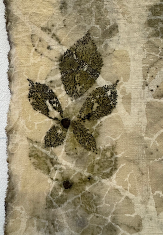 Ces kakémonos uniques sont créés avec la technique d'éco-teinture, où les vraies feuilles laissent leurs traces poétiques sur le tissu grâce au tannen des feuilles.